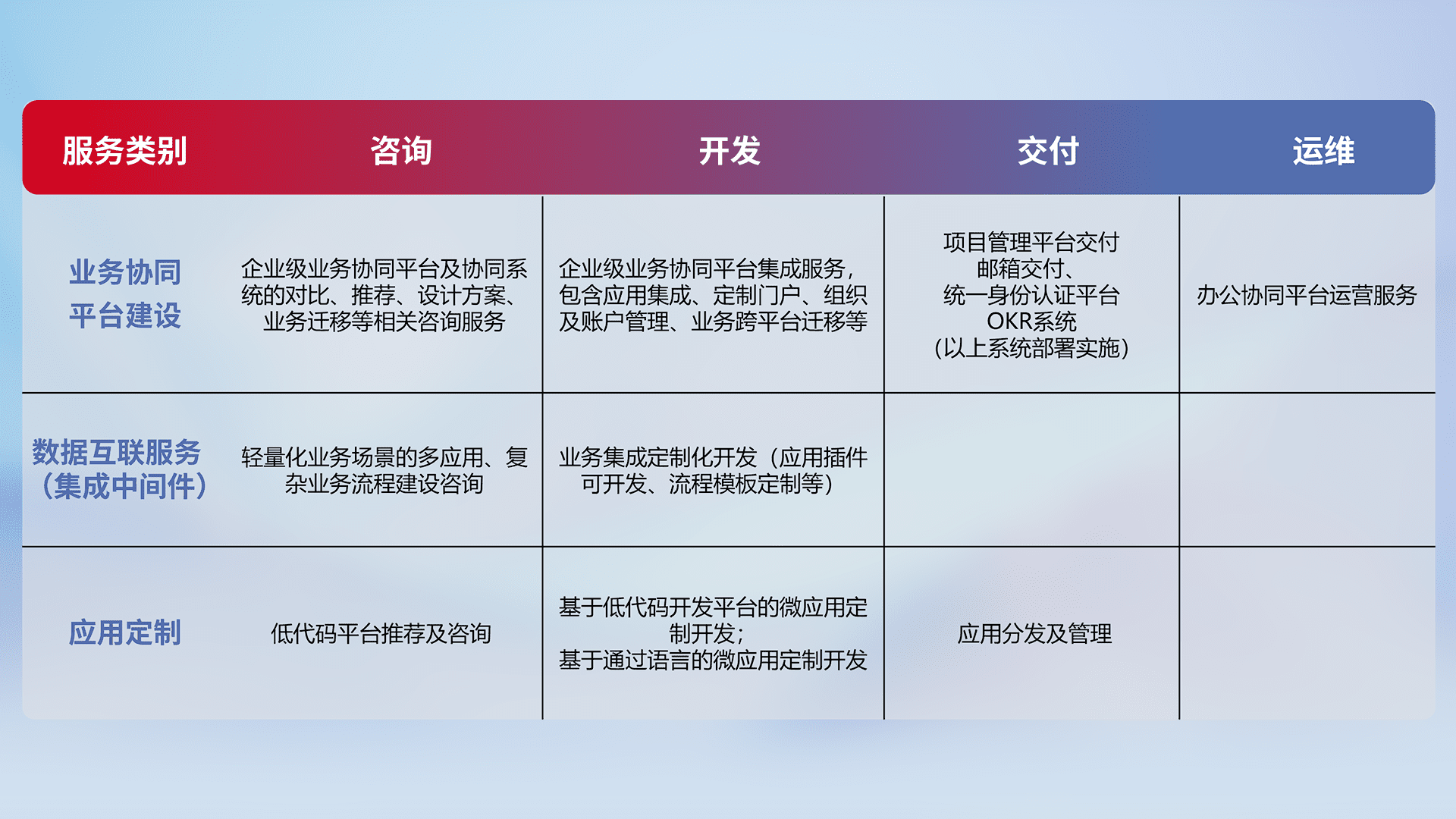 针对钉钉、、企微、、、、IDaas等平台级产品提供产品的规划、、方案、、交付、、、定制化开发等服务,,实现如统一协同办公、、、、智能客户服务、、、、混合会议管理、、、、智能数据查询、、、、等业务场景,,,实现数字化转型。。