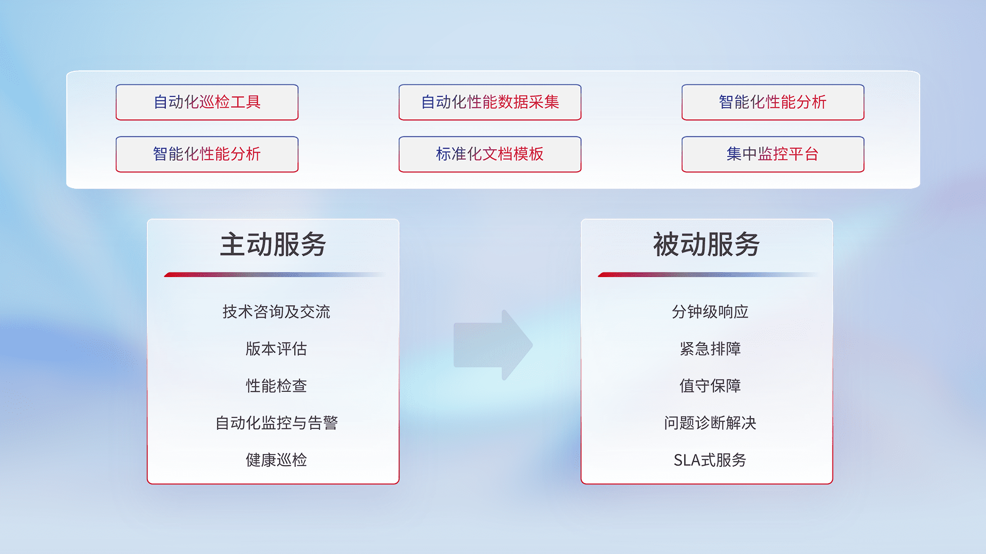智能化工具和标准化文档,,保障服务质量,,,,提供主动服务(包含技术咨询、、、、版本评估、、、、性能检查、、、自动化监控与告警、、、、健康巡检)和被动服务包含(分钟级响应、、、、紧急排障、、、、值守保障、、问题诊断解决、、、SLA服务)。。。